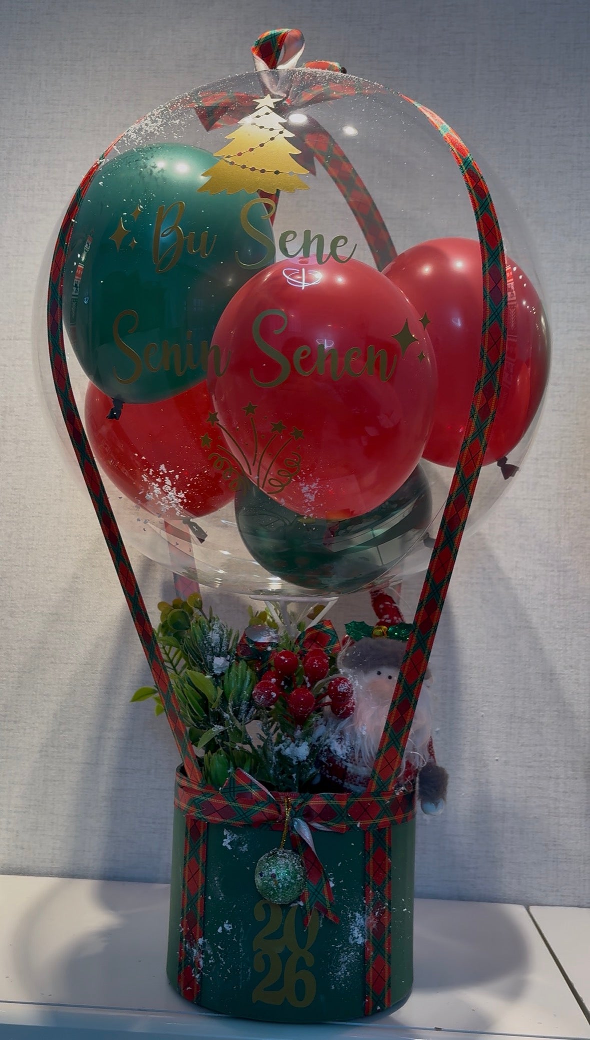 2026 Yeni Yıl Balonlu Hediye Kutusu – Kırmızı & Yeşil Yılbaşı Konsept Özel Tasarım