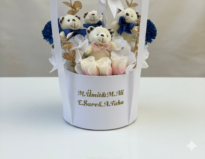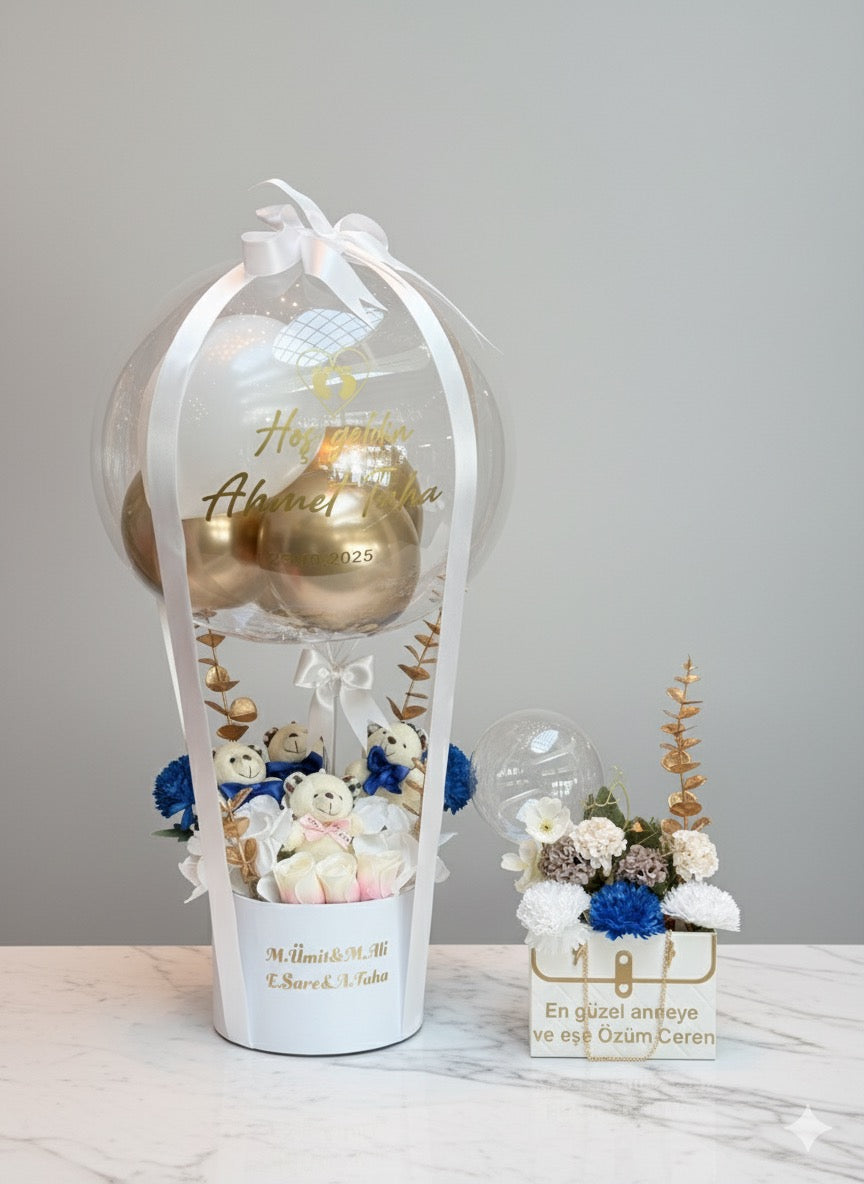 Şeffaf balonun içinde altın balonlar, çevresinde mavi-beyaz tonlarda çiçekler ve sevimli peluşlar yer alır.