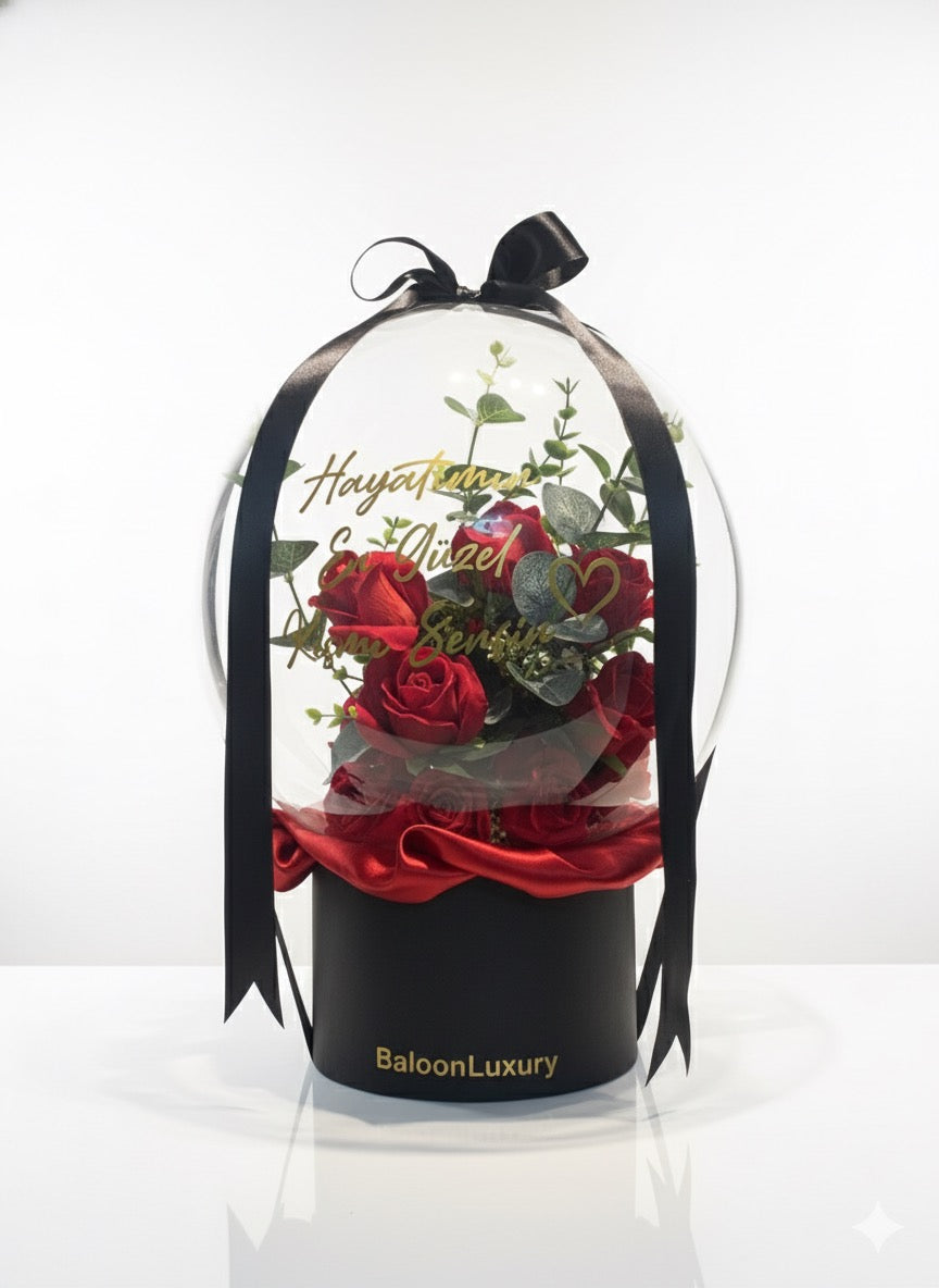 Zarif şeffaf balon içerisinde yer alan yapay gül ve kuru çiçek aranjmanı, şık kadife detaylarla süslenmiş özel kutusunda sunuluyor. Üst kısmındaki kurdele ve kişiye özel yazı ile Sevgilinize özel, zarif ve kalıcı bir hediye sunabilirsiniz.