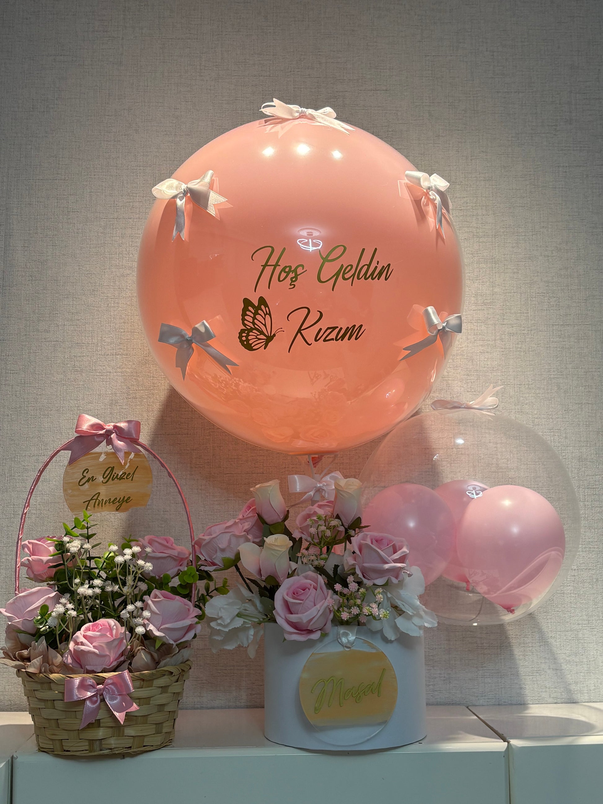 Yumuşak pembe tonlar, kelebek dokunuşları ve minimal fiyonk detaylarıyla hem modern hem de zamansız bir tasarım sunar. Hastane odasında şık bir dekor, fotoğraflarda ise zarif bir anı objesi olarak öne çıkar.