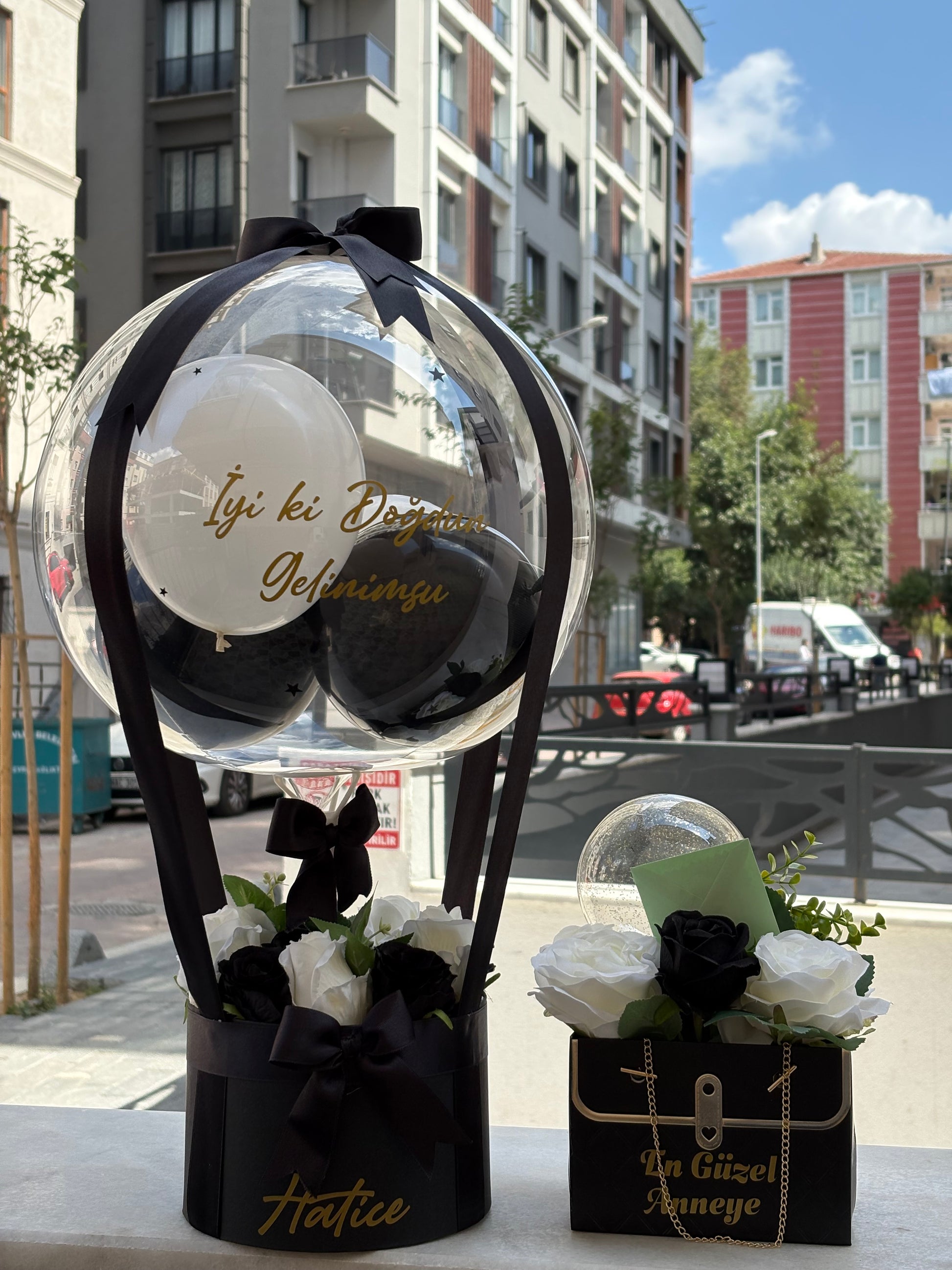 Siyahın zarafetini, altın detayların ışıltısıyla birleştiren bu özel hediye; sevgilinizin kalbine dokunacak en şık seçeneklerden biri.Şeffaf balon içinde kişiye özel yazı, siyah & beyaz çiçekler ve gold detaylarla hazırlanmış bu konsept; hem romantik hem de modern bir görünüme sahiptir.