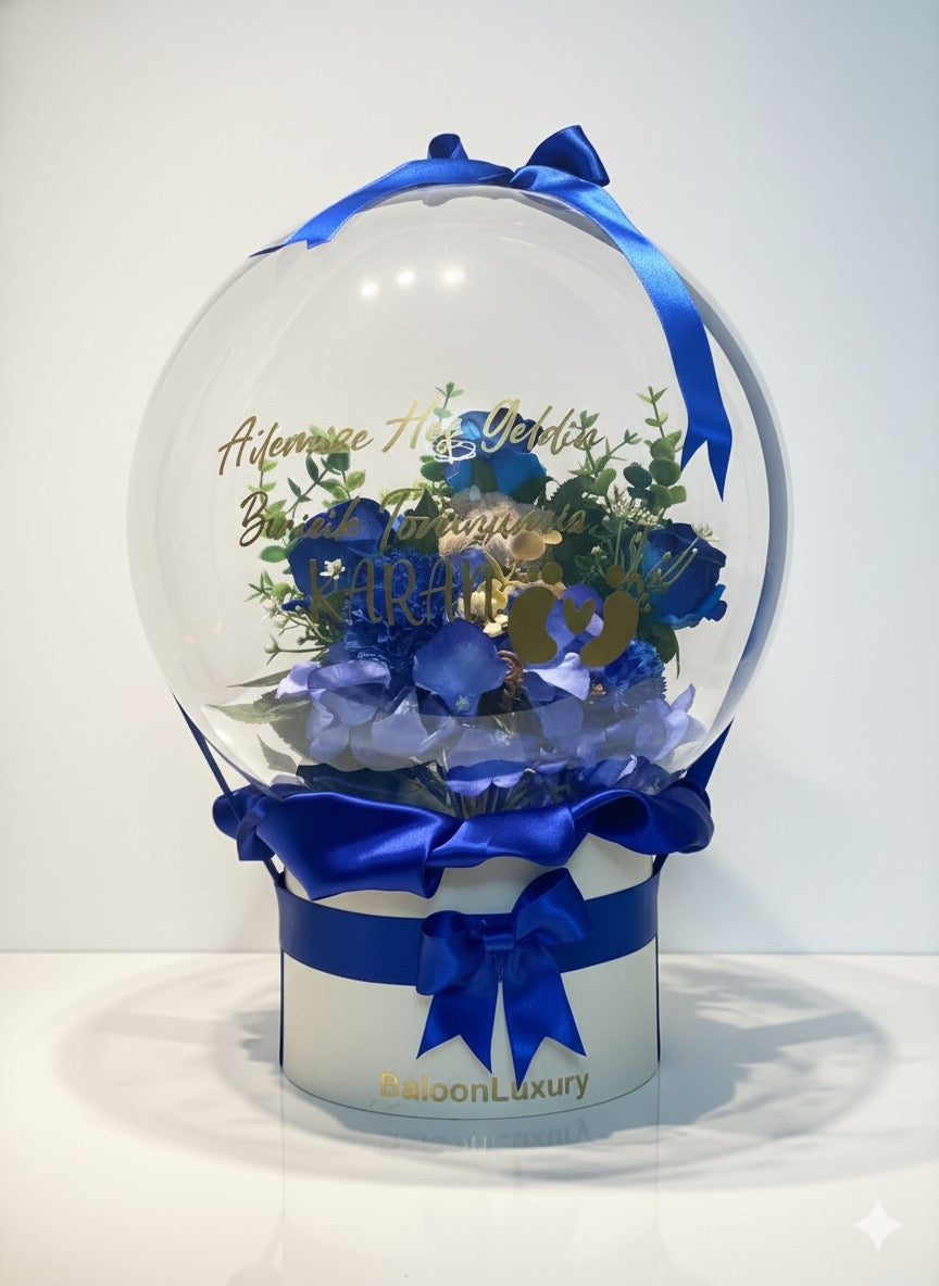 Özel günleriniz için kalıcı ve etkileyici bir hediye mi arıyorsunuz? Bu şeffaf fanus balon, canlı mavi güller ve yeşilliklerle doludur.