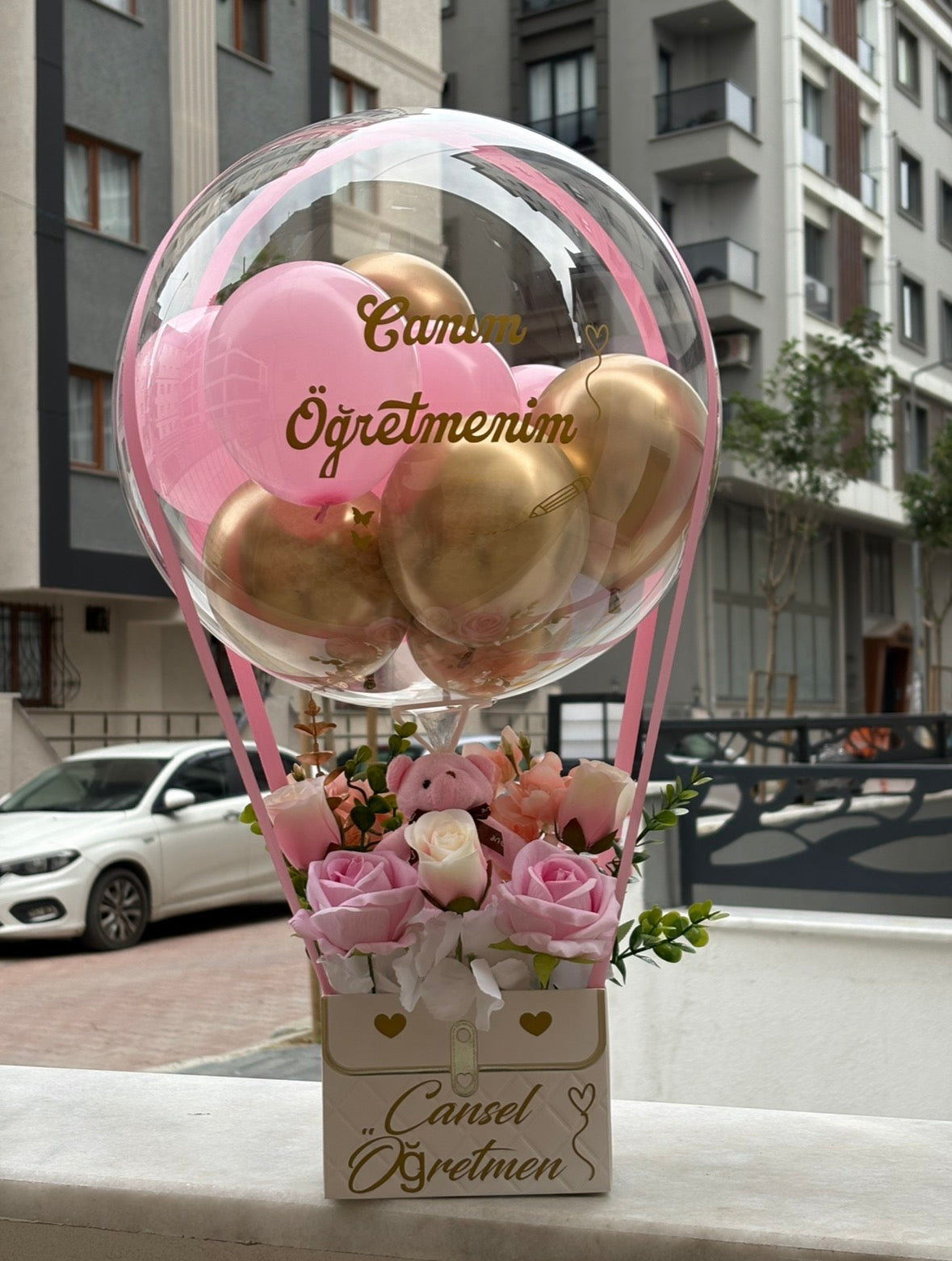 Şeffaf balonun içinde pastel pembe ve gold tonlarında mini balonlar yer alır. Alt kısmında özenle hazırlanmış yapay çiçek aranjmanı ve sevimli pelüş oyuncak detayıyla şık bir bütünlük oluşturur.